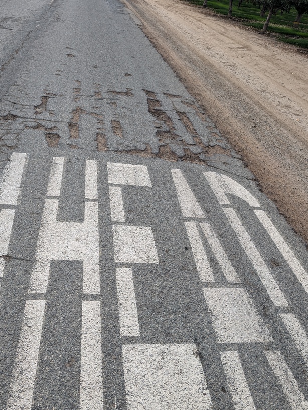 I am quite curious as to how the painted "AHEAD" managed to degrade the asphalt like that