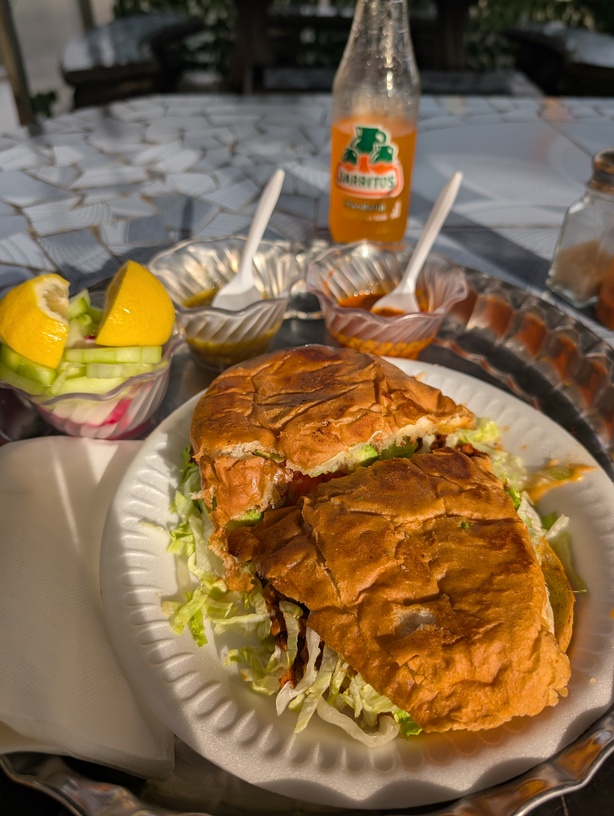 Stopped in Earlimart for a breakfast torta - this was the small one! - and soda, and then kept going south and mostly east until I arrived in Bakersfield midafternoon.