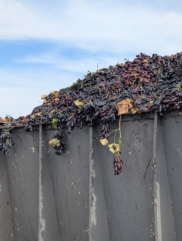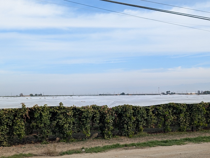 I got to see even more agricultural action during the ride - the vineyards were alive with throngs of mostly Hispanic workers picking, packing, packaging, and trucking the flats of grapes away from the fields. When I stopped to take the above picture, one friendly group explained they were wine grapes in this vineyard, since I could see that they weren't packaged as usual - just dumped in a truck. And that they looked less round and more finger-shaped than the grocery store grapes. Also: many of the grapes being harvested were wearing protective headgear (sunshades saran wrapped over the entire rows). But also pomegranates, garlic, and more on show today!